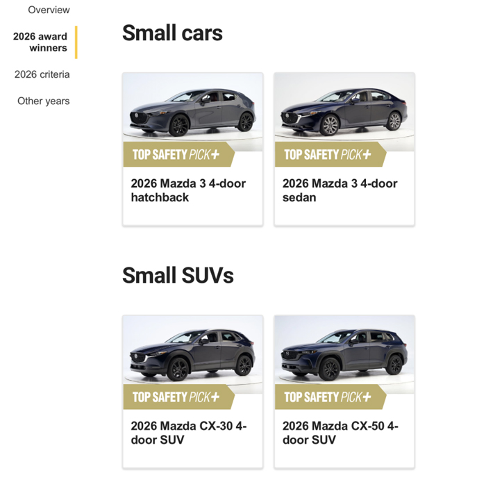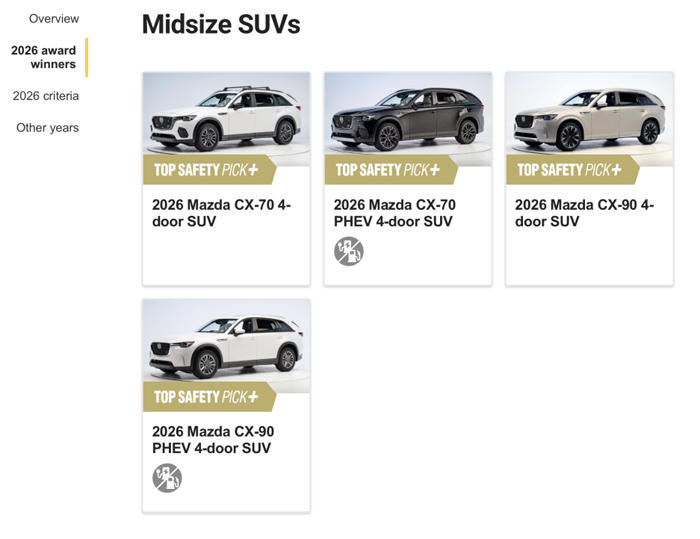 马自达8款车型再度斩获IIHS 2026年度顶级安全之选