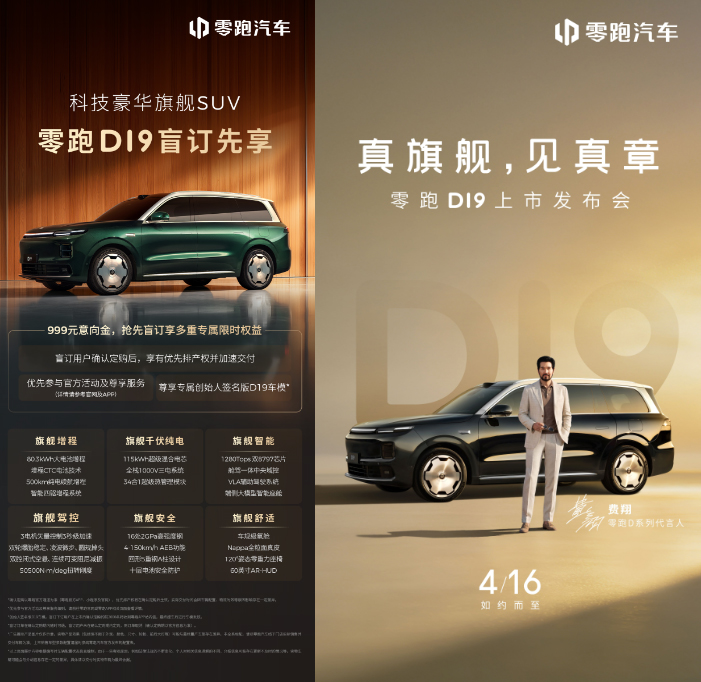 “真旗舰,见真章”,零跑旗舰D平台的首款车型——零跑D19将于4月16日正式上市。目前盲订权益仍在进行中,用户支付999元意向金,确认定购后可享优先排产权、加速交付、优先参与官方活动及尊享服务,并可获得专属创始人签名版D19车模(限量2000名)。