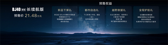 BJ40增程长续航版预售价为21.48万元,现在下订享四大预售权益:第一,新品下单礼。预售期内下订,享2000元抵5000元购车款权益。第二,都市自选礼。下订即享小书包、备胎二选一,实用装备随心搭配。第三,越野救援礼。无论戈壁深处、高原垭口,只要用户有需要,救援力量将快速免费抵达。第四,全程护航礼。全国8条保障线路、63家保障站已全面就位,提供免费检测、免费养护在内12项出行服务。
